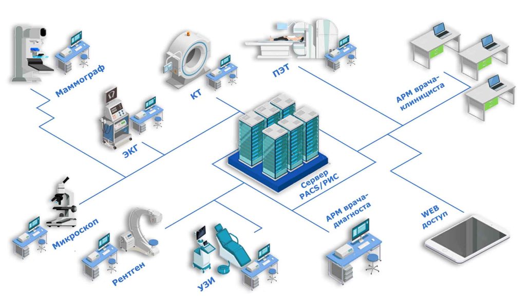 (англ. Picture Archiving and Communication System) — системы передачи и архивации DICOM изображений, предполагают создание специальных удалённых архивов на DICOM Серверах (PACS Server), где весьма объемный архив может длительное время существовать в «горячем» виде и быть быстро доступным для поиска и просмотра интересующей информации по DICOM сети.